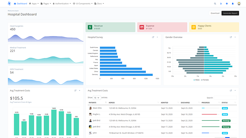 No matter if you start with Hospital UI and want to use HR-Project management widget, following the ALUI design architecture you can use any widget in any dashboard of the template.